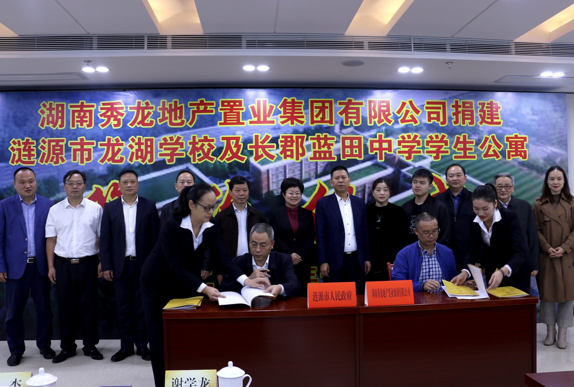 10月16日,湖南秀龙地产置业集团有限公司捐建涟源市龙湖学校及长郡蓝田中学学生公寓签约仪式在涟商总部举行。涟源市委书记谢学龙致辞,市委副书记、市长刘杰与秀龙地产总裁肖建新代表双方上台签约,市人大常委会主任梅国华主持签约仪式,秀龙地产董事长肖玉军讲话,市委常委、市委政法委书记李南新介绍捐资办学情况。市政协主席龙燕青,副市长梁毅等,秀龙地产监事陈新建女士、副董事长肖洛廒、副总裁李新国及部分长沙涟源商会代表出席签约仪式。